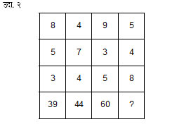 उत्तर : चौकोनातील प्रत्येक रकान्यातील पहिल्या व दुसऱ्या संख्येच्या बेरजेला तिसऱ्या संख्येने गुणल्यास चौथी संख्या मिळते. जसे,
